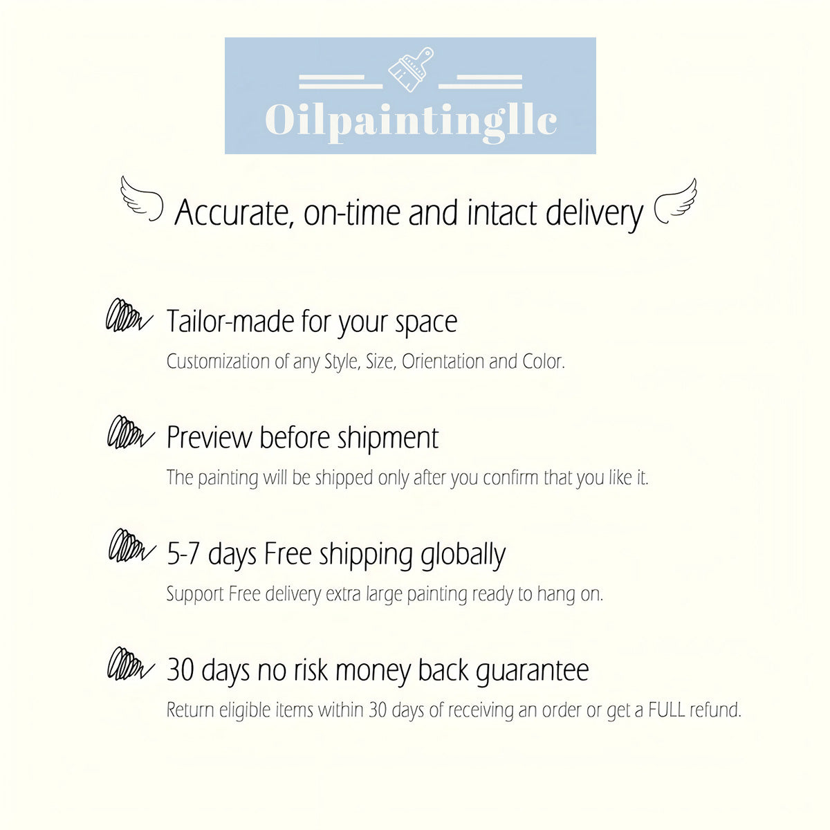 Because all our paintings are handmade and often custom made, there may be small or subtle changes in your painting. Your painting may not be exactly the same as the picture you ordered. It will be almost the same, but not exactly the same. What I can guarantee is the quality of the work we deliver, it will be a beautiful painting as you expect.